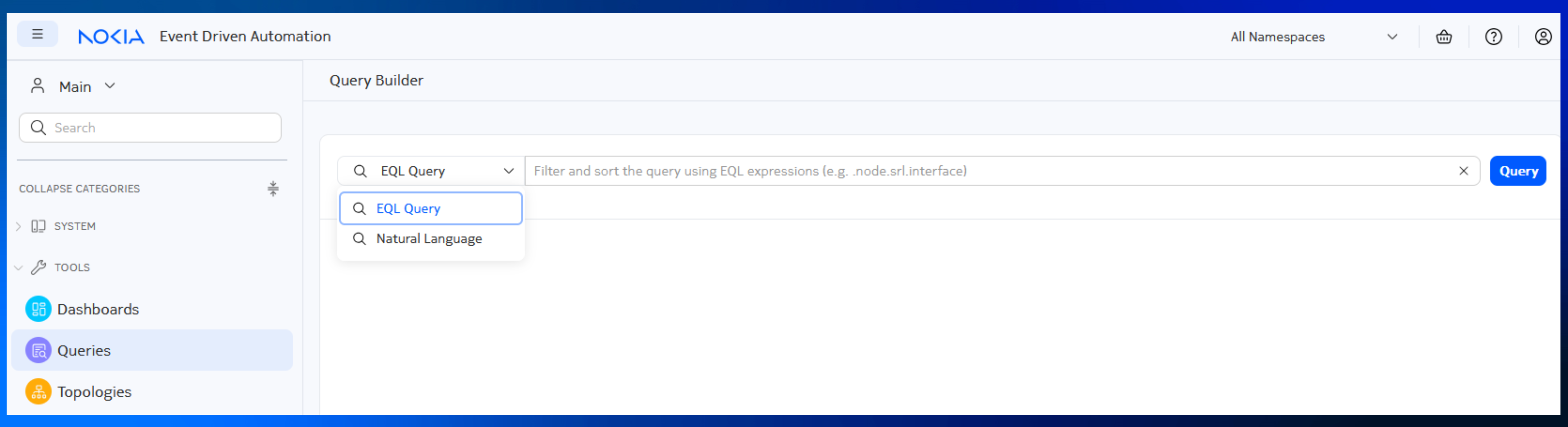 Short Description The EDA Query Language (EQL) enables real-time querying across the entire fleet of the managed nodes and EDB data.