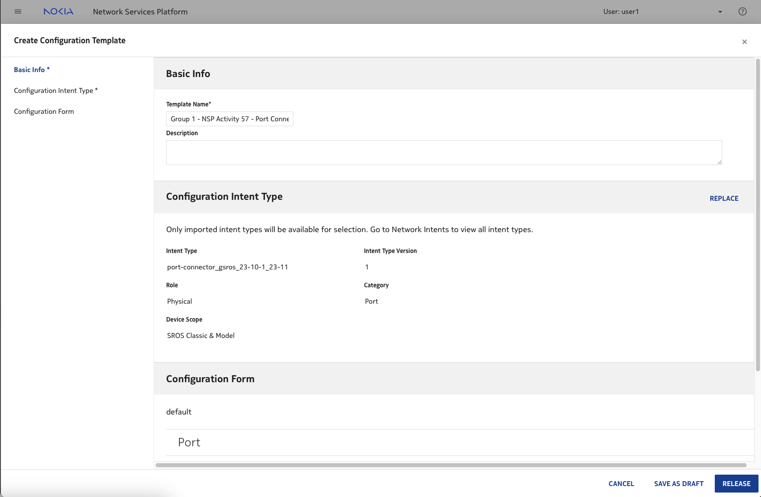 • Create a template called Group 10 - NSP Activity 57 - Port Connector using intent-type port-connector_gsros_<version>. Click Release.