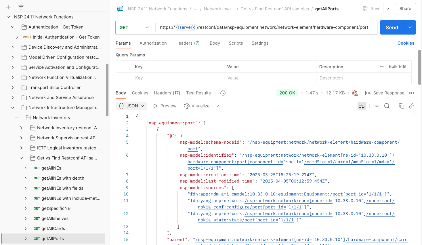 Execute the Filter ethernet ports Postman example found in 24.11 Network Functions > Network Infrastructure Management > Network Inventory > Get vs Find Restconf API samples> POST Filter ethernet ports. Because this is using the nsp-inventory:find RPC using RESTCONF POST, we can pass JSON in the Body tab to filter for specific ports. Inspect the Body tab and adjust the xpath filter.