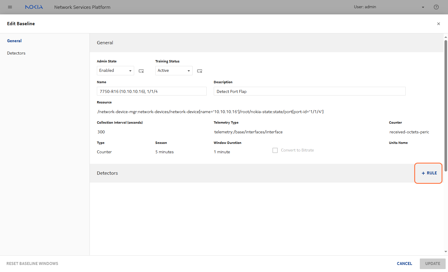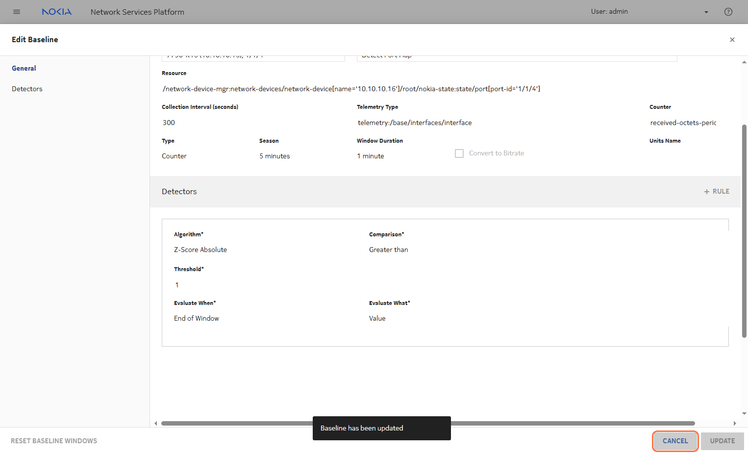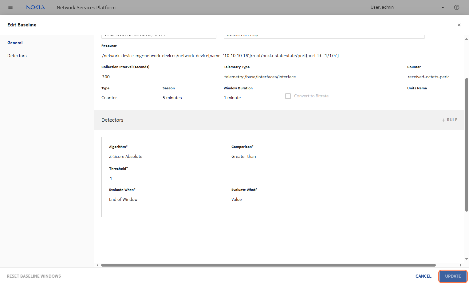 Based on the seasonality and window length, the detector rule will begin to apply. You need to configure the comparator to detect values less than a threshold close to 0. This helps identify anomalies such as port flapping, where there is a sudden drop in the metric value toward zero.